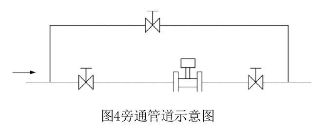 3)密封墊不能凸入管道內,其內徑可比傳感器內徑大1~2mm 4)如需斷流檢查與清洗傳感器,應設置旁通管道如圖4所示。