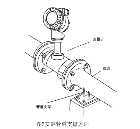 5)外部振動對渦街流量計的影響應該作為渦街流量計現(xiàn)場安裝的一個突出問題來關 注。首先在選擇傳感器安裝場所時盡量注意避開振動源。其次采用彈性軟管連接,在 小口徑中可以考慮。第三,加裝管道支撐物是有效的減振方法,一種管道支撐方法如 圖5所示。