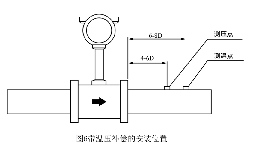 電氣安裝應注意傳感器與轉換器之前采用屏蔽電纜或低噪聲電纜連接,其距離不應 超過使用說明書的規(guī)定。布線時應遠離強功率電源線,盡量用單獨金屬套管保護。應遵 循“一點接地”原則,接地電阻應小于10Ω。整體型和分離型都應在傳感器側接地,轉 換器外殼接地點應與傳感器“同地”。帶溫壓補償時安裝位置,如圖6所示。