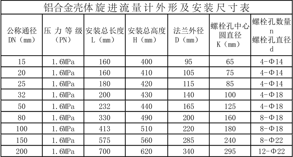 1.鋁合金殼體旋進(jìn)流量計(jì)外形尺寸(表2)
