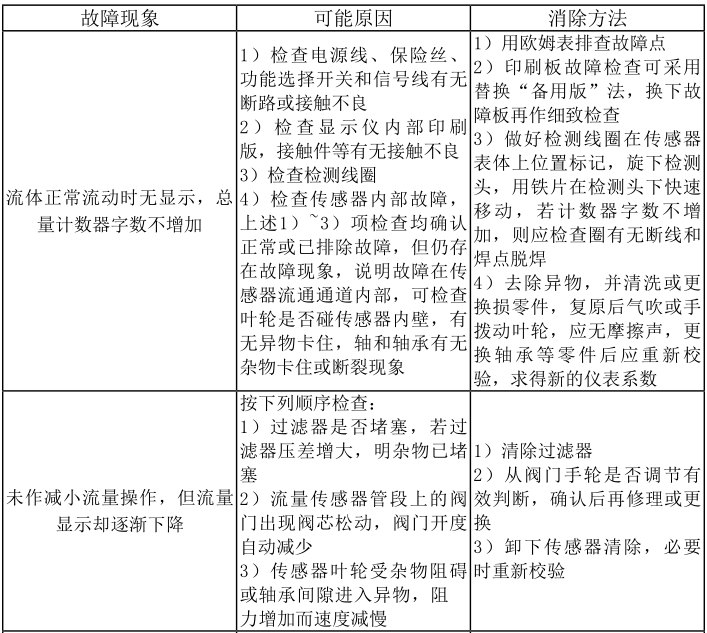 14.為保證流量計(jì)長(zhǎng)期正常工作,要加強(qiáng)儀表的運(yùn)行檢查,一旦發(fā)現(xiàn)異常及 時(shí)采取措施排除。監(jiān)測(cè)葉輪旋轉(zhuǎn)情況,如聽到異常聲音,用示波器監(jiān)測(cè)檢測(cè)線圈 輸出波形,如有異常波形,應(yīng)及時(shí)卸下檢查傳感器內(nèi)部零件。如懷疑有不正?,F(xiàn) 象應(yīng)及時(shí)檢查。保持過(guò)濾器暢通,過(guò)濾器可從出入口壓力計(jì)的壓差來(lái)判斷是否堵 塞。要定期排放消氣器中從液體逸出的氣體等等。
